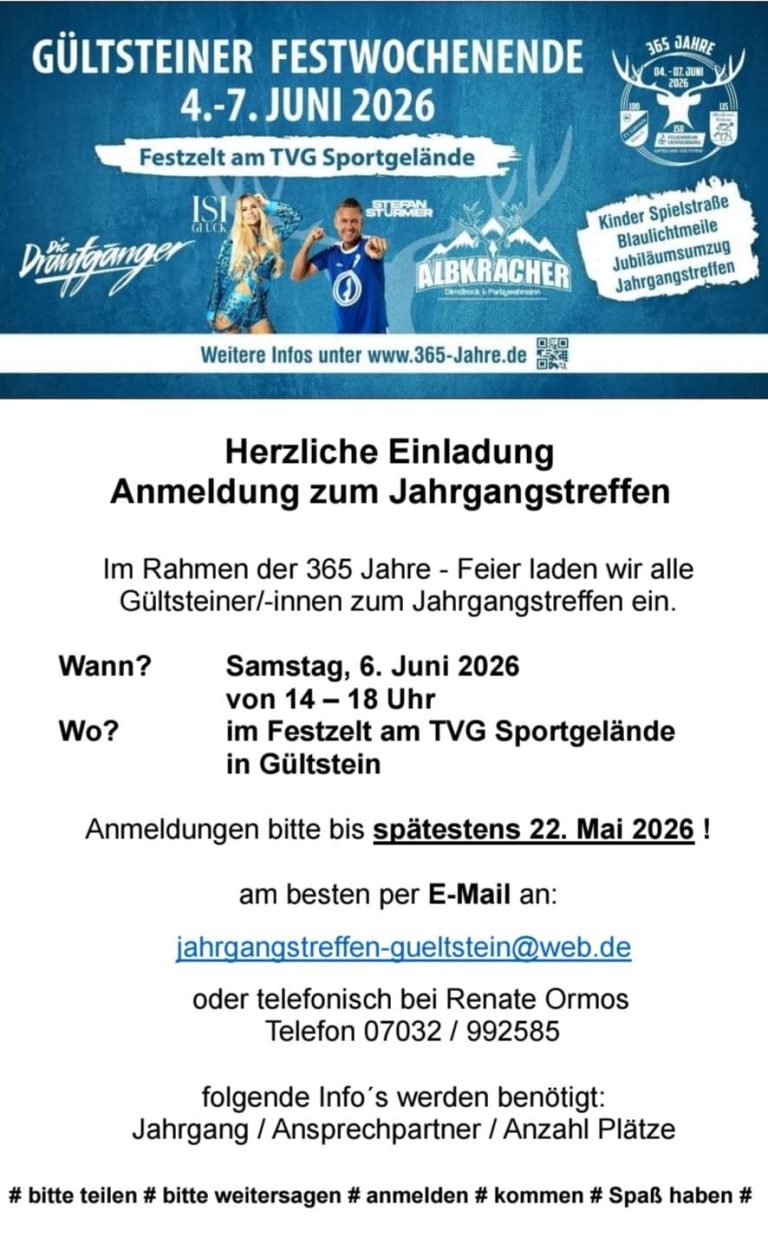 Liebe Gültsteiner und Gültsteinerinnen. Hiermit möchten wir euch herzlich zum Jahrgangstreffen an unserem Jubiläumswochenende einladen! Am Samstag den 06.06 von 14 bis 18 Uhr findet das Jahrgangstreffen im Festzelt am TVG Sportgelände statt.